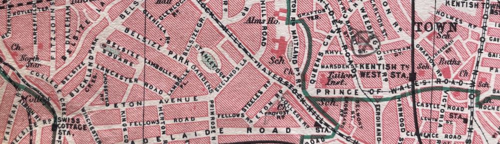 Page from the London Pocket Atlas and Guide (Bartholomew, 1939) showing location of Adelaide and Fellows Roads (between Swiss Cottage and Chalk Farm stations)