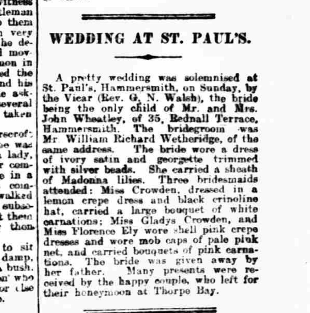 Hilda became Mrs Wetheridge on 14 September 1924 at St Paul’s Church, Hammersmith. Dating from the 17th century, the church was rebuilt in 1880 in the early English Gothic style with an imposing tower. Today, it lies close to the Hammersmith flyover on Queen Caroline Street, a short walk from Hammersmith tube station.