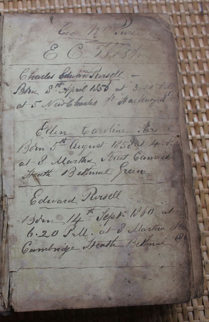 One of the flyleaves in the Pursell family bible where my great great grandfather George William Pursell has listed the details of births (and untimely deaths) of all 13 of his children. This page shows my great grandfather Charles’ birth, followed by his sister Ellen and brother Edward.