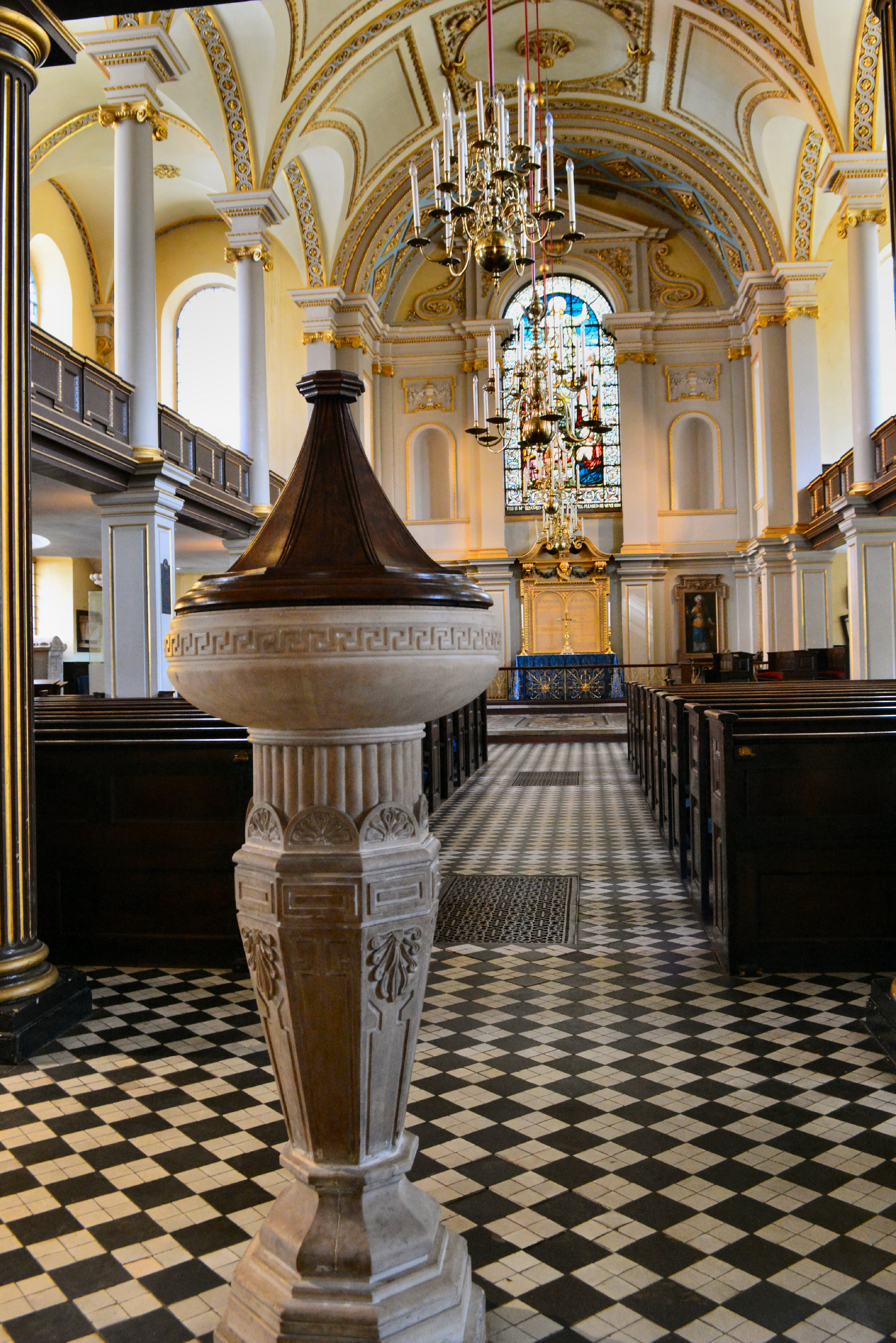 St Giles in the Fields, interior from the entrance, with font, 2019 / Andy Scott. Own work CC-BY-SA-4.0