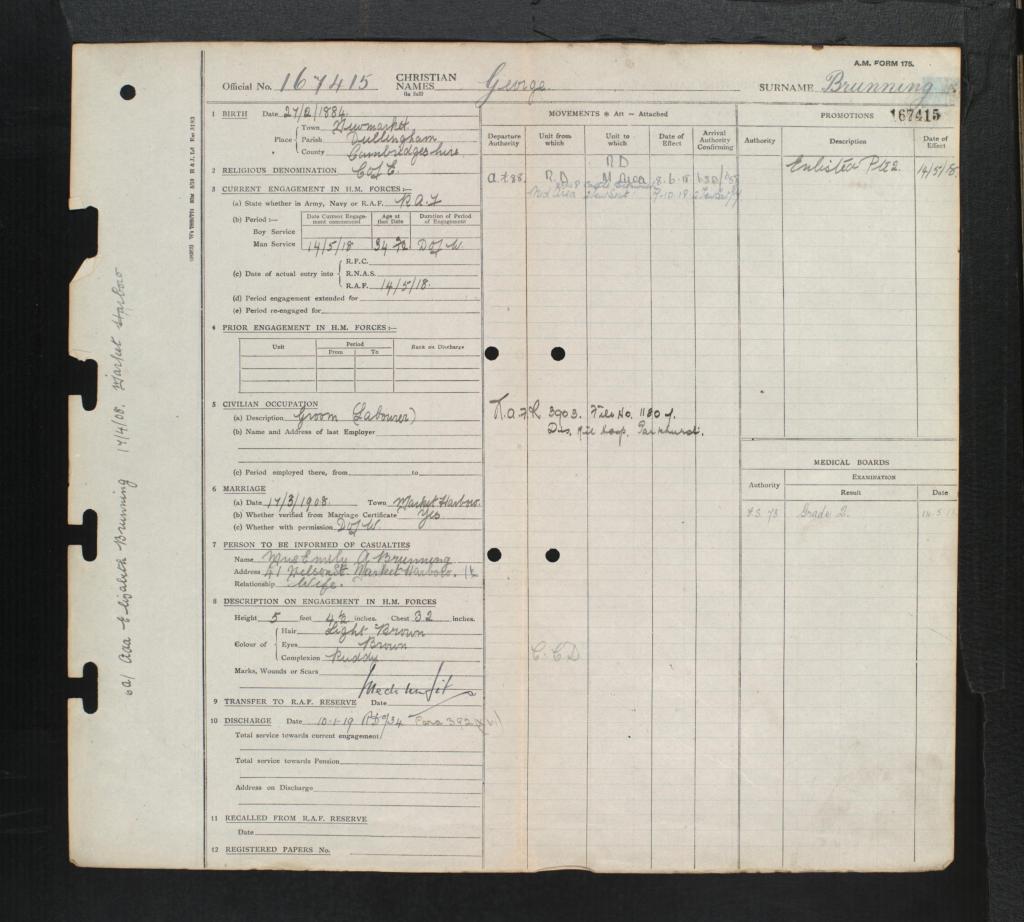 George Brunning’s service records for the RAF. He is 34 and 3 months when he enlists. The age is recorded correctly but the year has been mistakenly written as 1884 rather than 1881. A slip of the pen? [British Royal Air Force, Airmen’s Service Records 1912-1939 via Find My Past website]