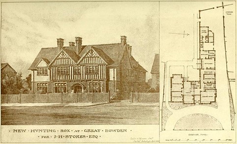 “This hunting box has been erected for Mr JH Stokes. The architects are Messrs Coates and Johnson of Market Harborough”. A hunting box was a hunting lodge or house meant for refreshments, for use during the hunting season. [From: The Building News, 1901]