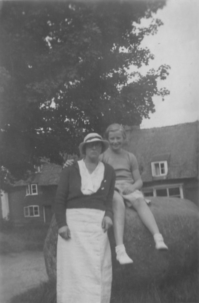 Mum sitting on the Hartest Stone, with her mother, my Nanna Betts (née Annie Brunning), c1936. When this photo was taken, another of Nanna Betts’ many cousins, George Redgrave was running the village post office on The Green. He had taken over from his grandparents as postmaster in about 1906. The thatched cottage behind them is still in existence (partly visible on far right in picture below). [Family photo]