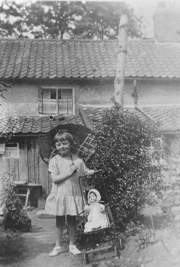 Mum in Grandad Brunning’s garden in Little Cressingham, Norfolk, c1929. [Family photo]