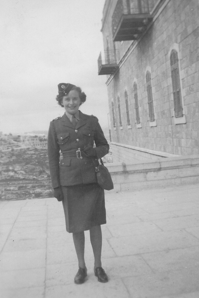 Photo: Mum in full ATS uniform complete with the twisted cord lanyard on her right shoulder wearing a side cap as well as her army-issue handbag. Pictured somewhere in Jerusalem (outside the King David Hotel?, in late 1944 or early 1945.